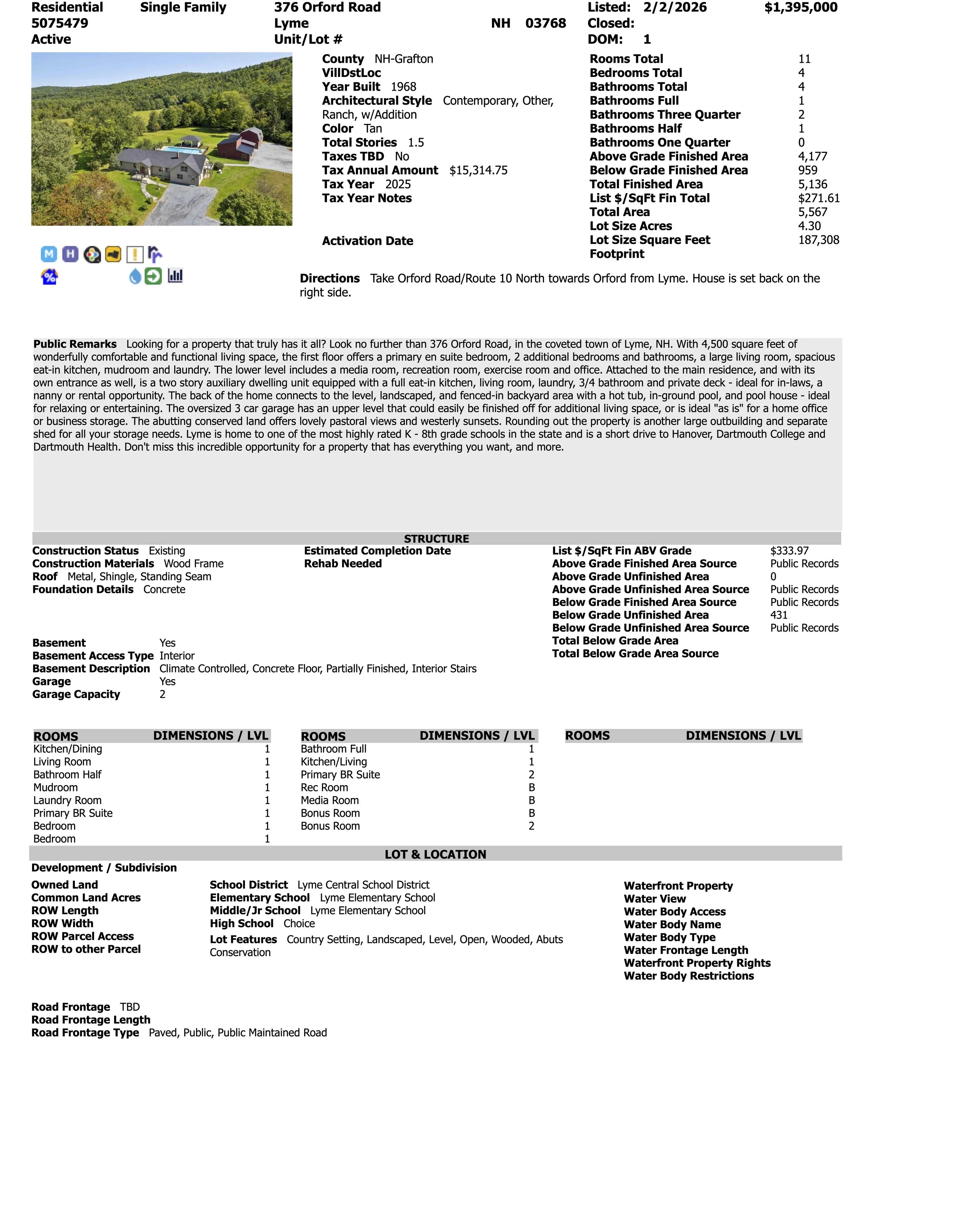 376 ORFORD ROAD – Looking for a property that truly has it all? Look no further than 376 Orford Road, in the coveted town of Lyme, NH. With over 4,500 square feet of wonderfully comfortable and functional living space, the first floor offers a primary en suite bedroom, 2 additional bedrooms and bathrooms, a large living room, spacious eat-in kitchen, mudroom and laundry. The lower level includes a media room, recreation room, exercise room and office. Attached to the main residence, and with its own entrance as well, is a two story auxiliary dwelling unit equipped with a full eat-in kitchen, living room, laundry, 3/4 bathroom and private deck - ideal for in-laws, a nanny or rental opportunity. The back of the home connects to the level, landscaped, and fenced-in backyard area with an in-ground pool, hot tub, and pool house - ideal for relaxing or entertaining. The oversized 3 car garage has an upper level that could easily be finished off for additional living space, or is ideal "as is" for a home office or business storage. The abutting conserved land offers lovely pastoral views and westerly sunsets. Rounding out the property is another large outbuilding and separate shed for all your storage needs. Lyme is home to one of the most highly rated K - 8th grade schools in the state and is a short drive to Hanover, Dartmouth College and Dartmouth Health. Don't miss this incredible opportunity for a property that has everything you want, and more.